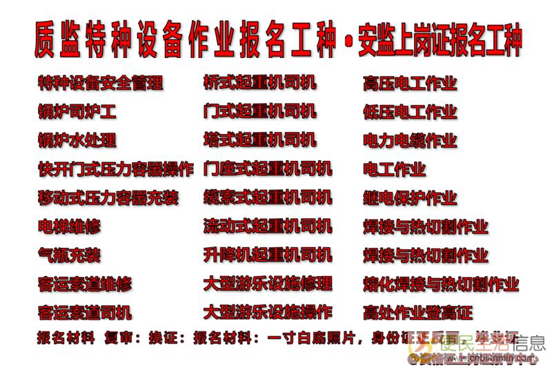 特种设备安全管理,锅炉司炉、起重机司机、叉车司机、客运索道司机、客运索道维修、大型游乐设施维修、大型游乐设施操作、电梯维修安装、起重机指挥、观光车司机、移动压力容器充装、锅炉水处理等等其它均可